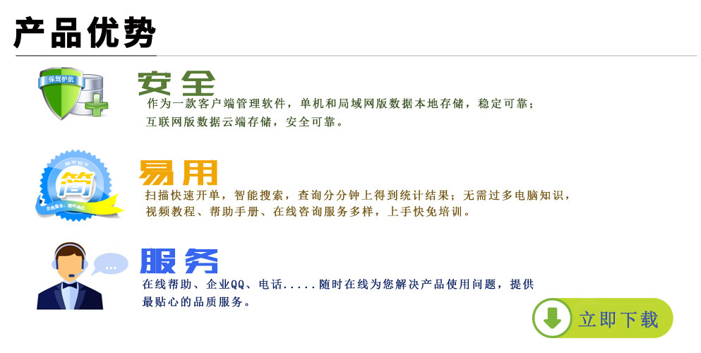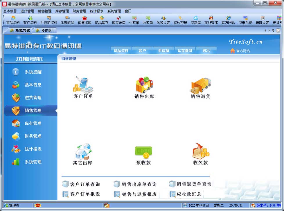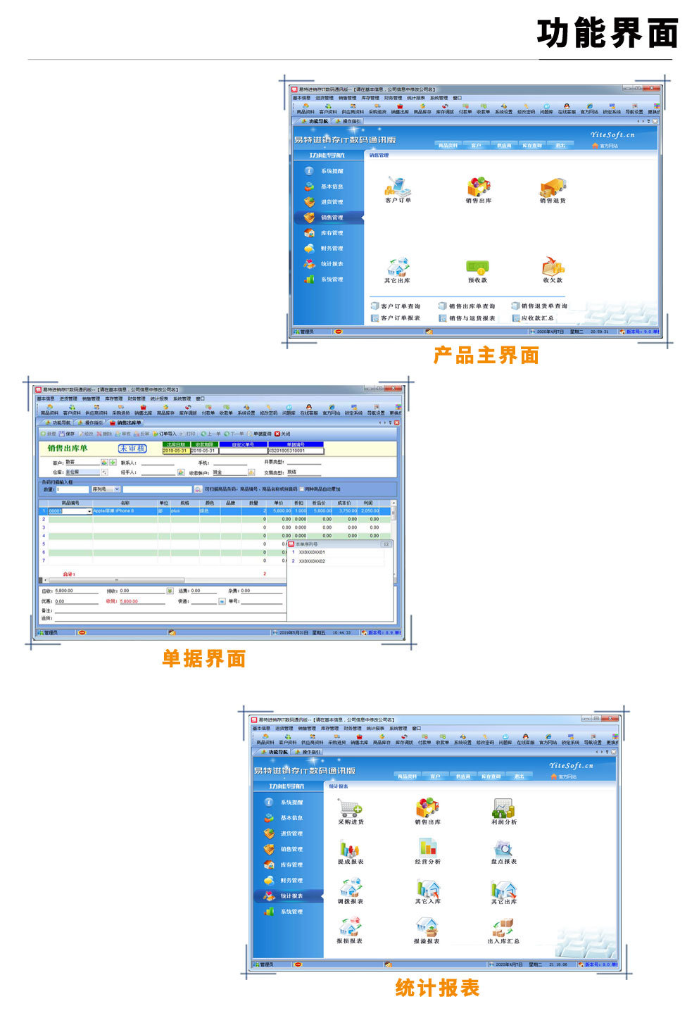 | 易特進銷存IT數碼通訊版是一款專業的進銷存存軟件,針對有序列號/串號管理需求的商品而設計開發,其中包含商品銷售管理系統 ,庫存管理系統(倉庫管理系統),財務和報表系統等子模塊。軟件界面設計簡潔,美觀,其人性化的軟件流程,使普通用戶不需培訓也能很快掌握軟件操作使用方法,上手極易。強大報表與集成查詢功能是本軟件的最大特色,所有功能在用戶需要的使用地方自然體現,不用打開多個窗口重復查詢。易特進銷存軟件廣泛適用于企業,商貿公司,個體門店等用于商業銷售管理, 庫存管理,財務管理等,客戶管理,員工管理等場合,是您企業進行信息化管理的強大工具。 基礎數據:商品信息,供應商,客戶,商品分類,倉庫,銀行等基本信息的設置。 入庫管理:進行貨品采購入庫,采購退貨,進貨單據和退貨單據查詢,供應商往來帳務,供應商付款。 出庫管理:銷售出貨,客戶退貨,銷售單據和客戶退貨查詢,客戶往來帳務,客戶付款。 庫存管理:包括庫存之間貨品調拔,庫存報損、報溢,庫存盤點功能。 拆分組裝:整進散出,或是整出散進等可以自由的拆分組合產品。 統計報表:完整的統計查詢功能,每張單據每次業務金額都可以清楚的反映。 權限管理:可添加刪除系統操作員帳號,強大的權限控制,可以設置某用戶對某窗口某個按鈕的權限。 打印設計:可對系統內每個單據進行打印的格式設計,可以導出,導入,每個操作員可設計自己的打印格式。 界面設計:系統窗口界面名稱可以自定義設計,表格的顯示順序,寬度,是否顯示等,每個操作員可以設計自己的界面。 系統設置:可以靈活設置系統小數位數,可選0-6位,讓帳務更精確,可對以往數據進行選擇性的清除,以便系統初始化。 數據備份:可隨時對系統數據庫進行安全備份,以防數據丟失。 3、 屏幕分辨率800X600以 |